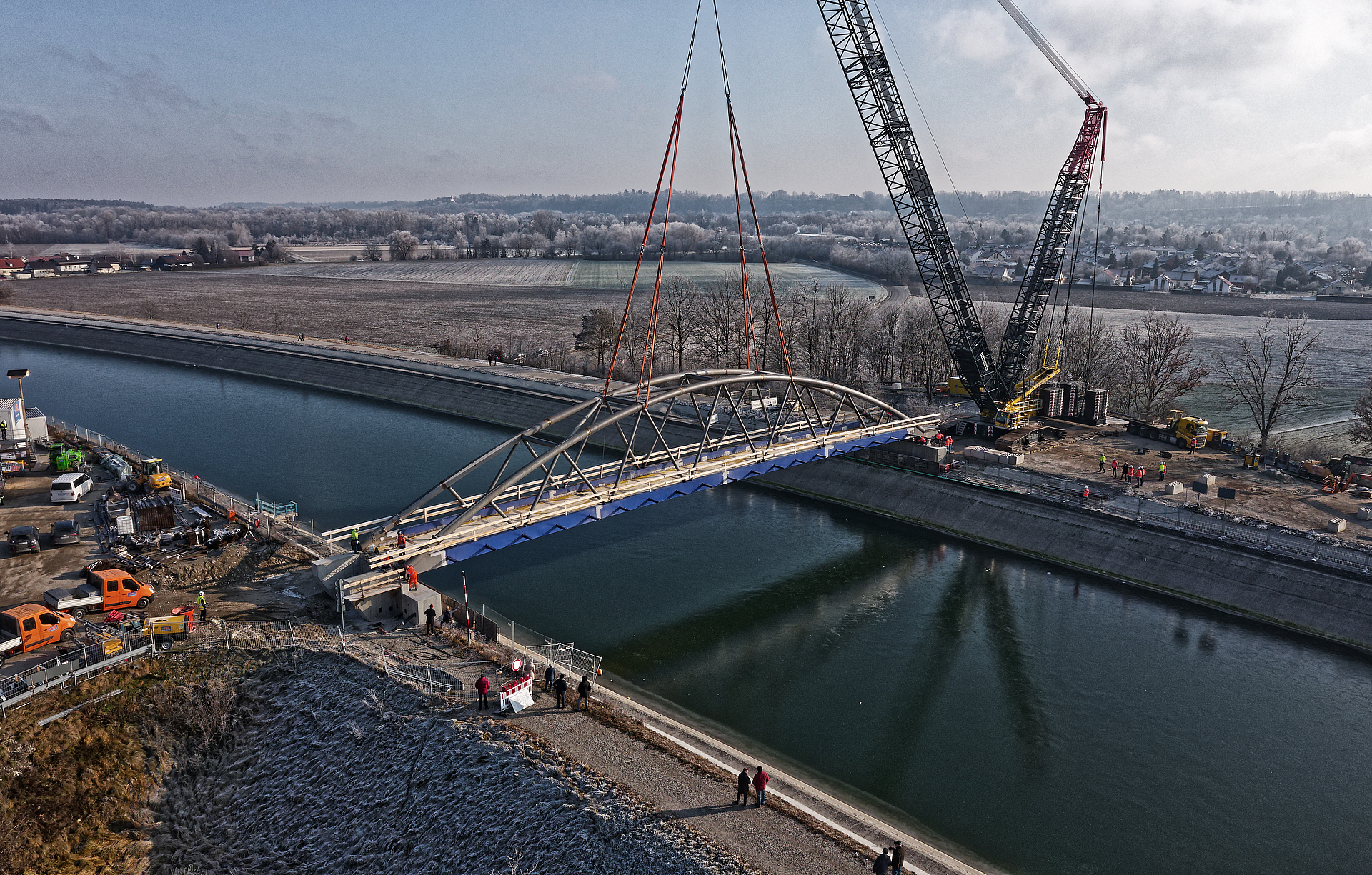 Einhub der Stahlkonstruktion mittels Raupenkran und anschließende Betonage der Fahrbahnplatte