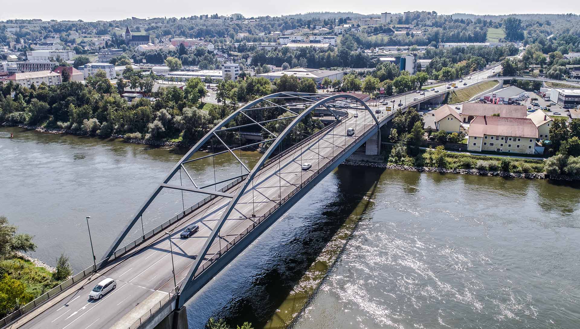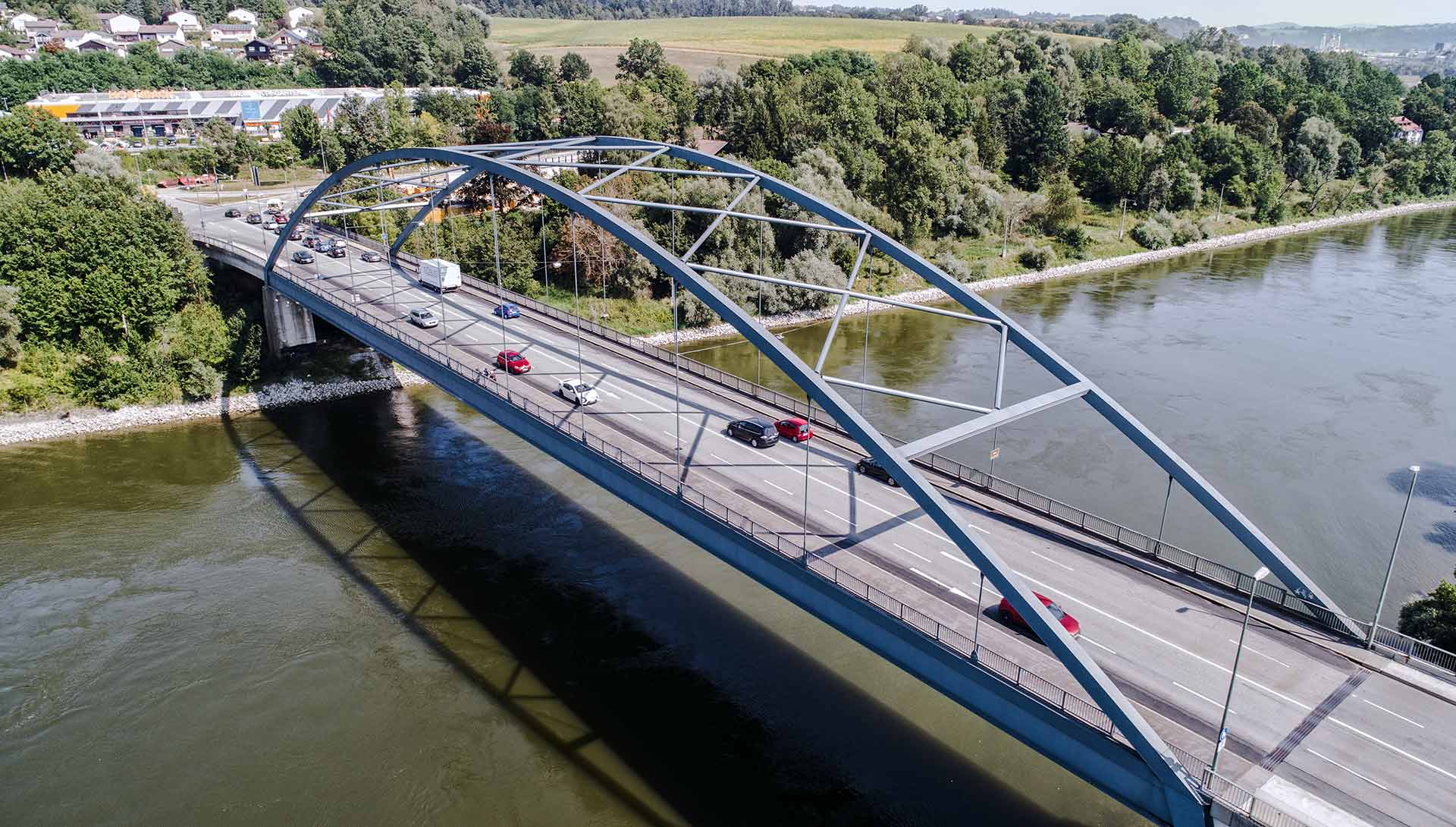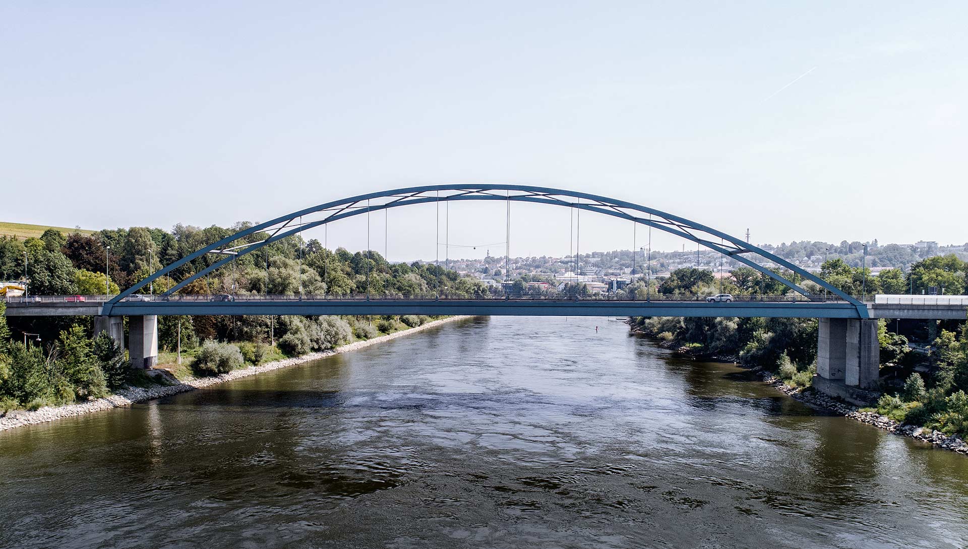 Stählerne Stabbogenbrücke mit angehängter Fahrbahn, orthotrope Fahrbahnplatte