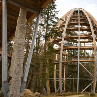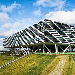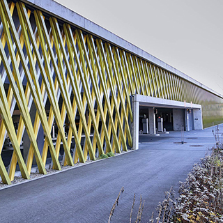 aus Stahlbetonfertigteilen erstelltes Bauwerk mit segmentbogenförmigen Grundriss